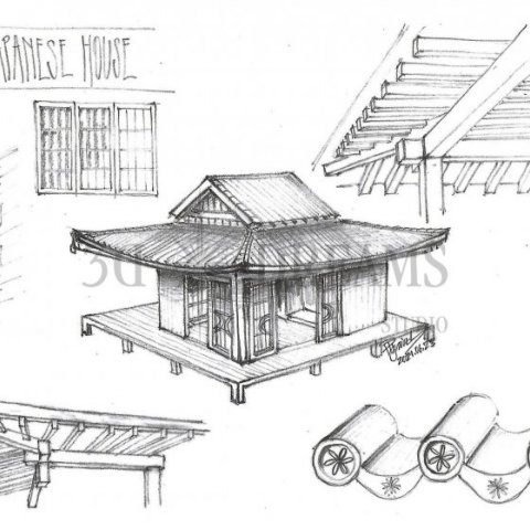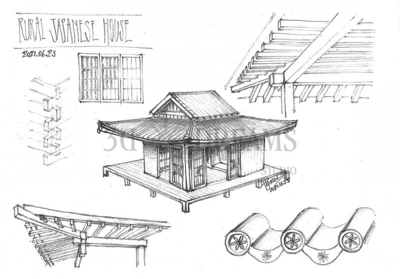 Numa primeira abordagem, seguimos o mesmo método que aplicámos na “Casa Japonesa Metálica”, onde aplicámos um desenho que representasse as principais características da Arquitetura Tradicional Japonesa, no campo. Numa segunda fase, foi feito o seu modelo 3D aplicando programas paramétricos específicos para modelação 3D, e que incluem o Fusion e AutoCAD, entre outros, seguindo-se a sua impressão numa impressora 3D para produzir um modelo 3D, em cortiça.
