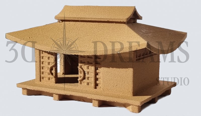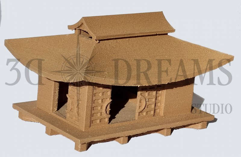 Apresentamos um novo modelo impresso em 3D, em que temos trabalhado – a “Casa Japonesa em Cortiça” – semelhante ao modelo “Casa Japonesa Metálica”, em dedicação à Arquitetura Japonesa. Este modelo impresso em 3D é feito em cortiça, e foi desenhado e impresso em 3D pela 3D+Dreams, estabelecendo uma ligação das Novas Tecnologias com a Arquitetura. O Minimalismo é característico da Arquitetura Tradicional Japonesa, onde a cobertura ocupa um lugar de destaque, com bonitas formas curvas. Na verdade, o telhado curvo tem um significado e função simbólica na Cultura Japonesa, que é afastar as forças dos maus espíritos. As paredes, por outro lado, são finas e delicadas para permitir a entrada da luz, e por esta razão as Casas Japonesas são fortemente iluminadas no seu interior.